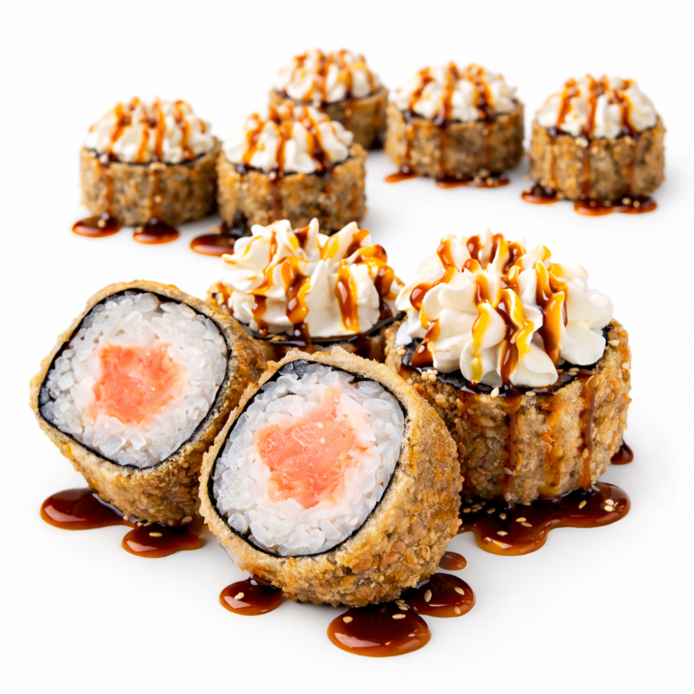 Сыр твороженный, унаги соус, панировка. На выбор: лосось, креветка, курица, кальмар, угорь.