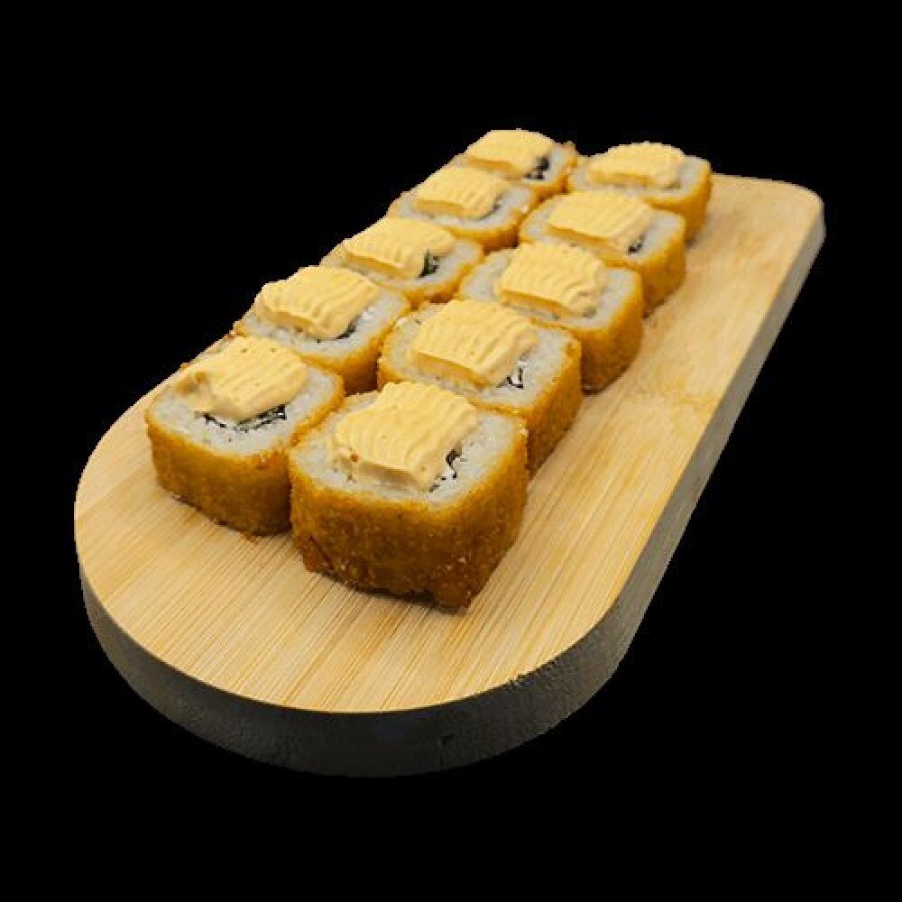 Сыр твороженный, огурец, соус спайси, панировка. На выбор: лосось, креветка, курица, мидии, кальмар, угорь.