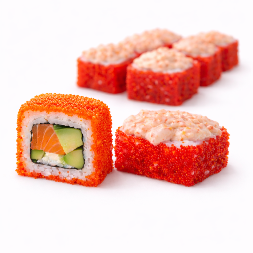 Майонез, авокадо, икра тобико, икорный соус. На выбор только ОДНА добавка: