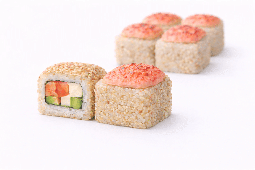 Сыр твороженный, огурец, кунжут, соус икорный. На выбор только ОДНА добавка: лосось, креветка, курица, мидии, кальмар, краб
