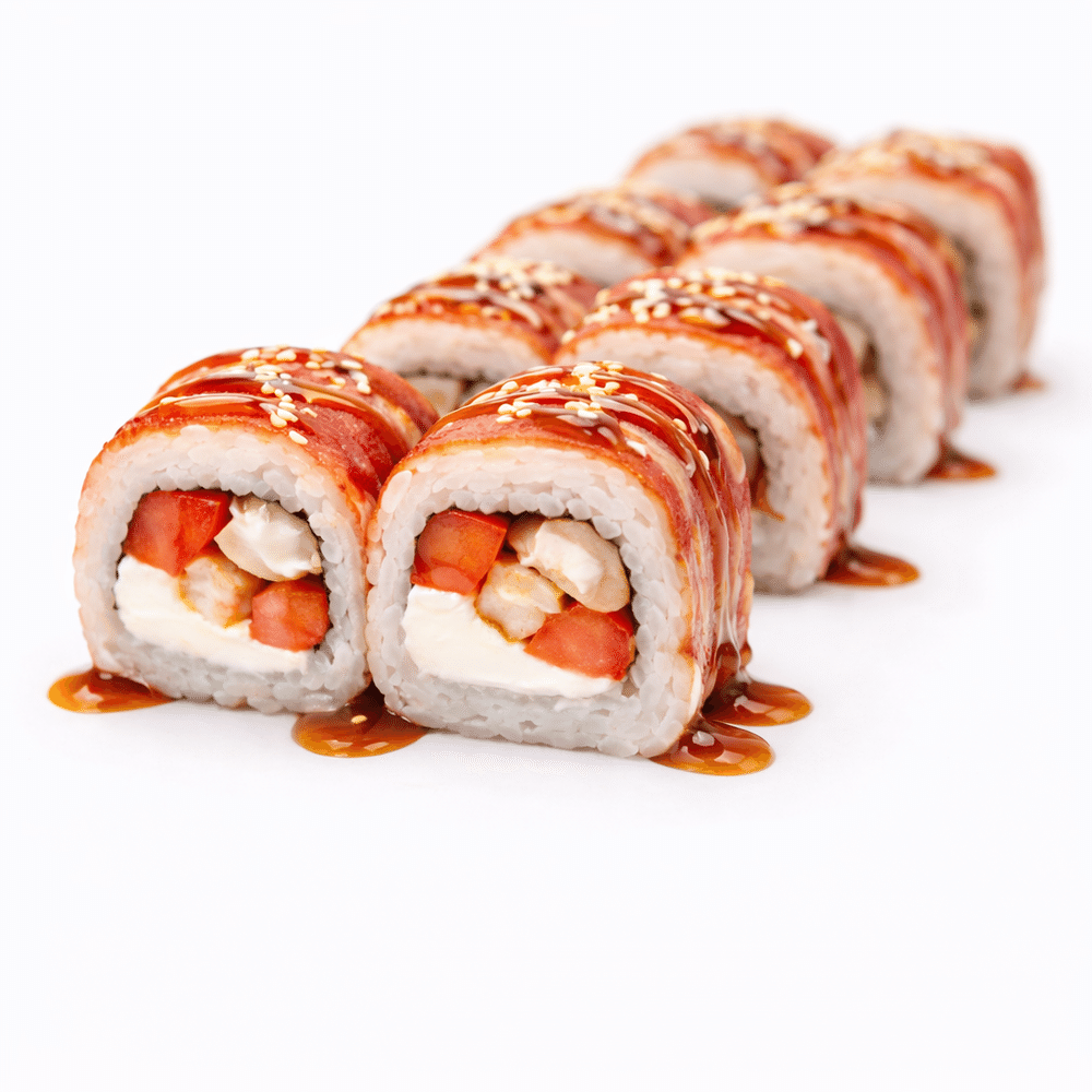 Сыр твороженый, бекон, курица, помидора, соус унаги, кунжут