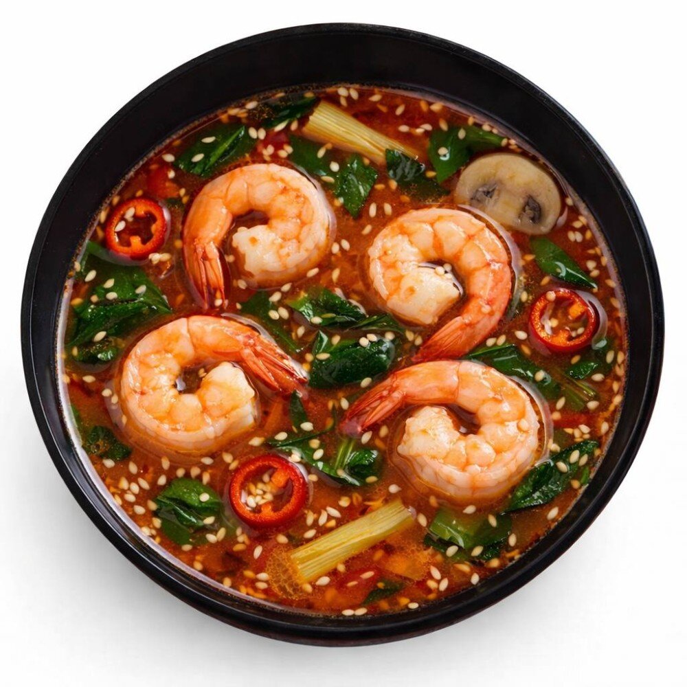 Кокосовое молоко, шампиньон, креветка, лук зелёный, паста том ям, паста кимчи, мирин, корень имбиря, лимон, перец чили, соль, рис
