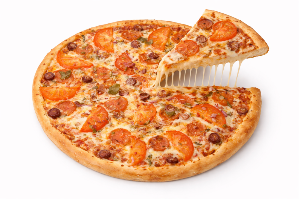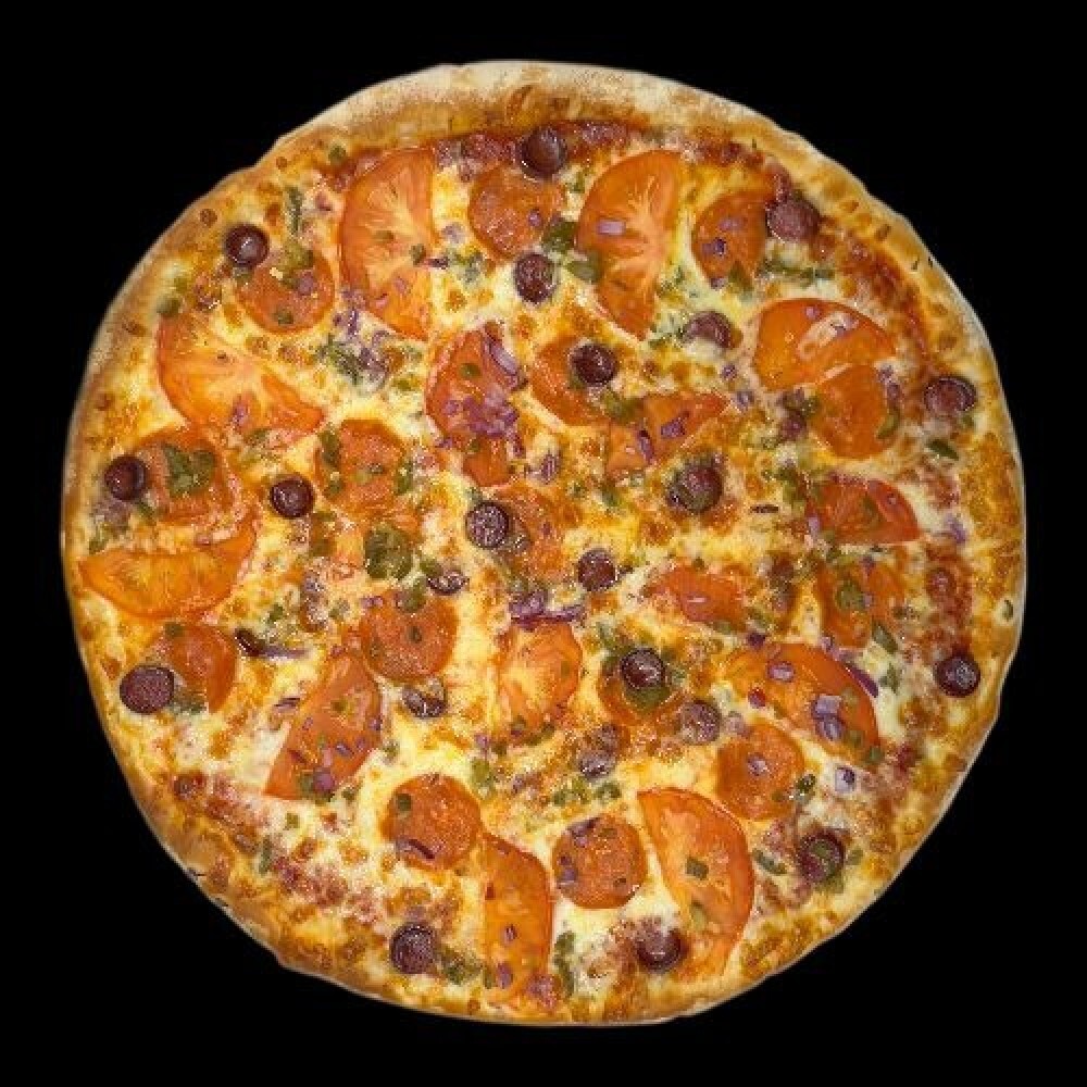 Пицца соус, моцарелла, пепперони, помидор, охотничьи колбаски, перец халапеньо, лук красный, чеснок