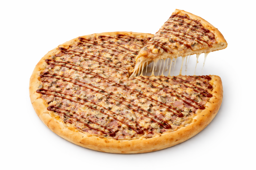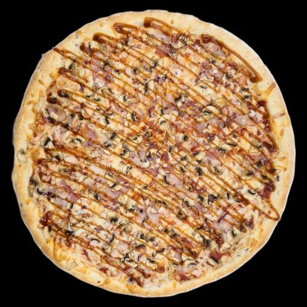 Пицца соус, моцарелла, бекон, курица, шампиньоны, лук красный, соус барбекю