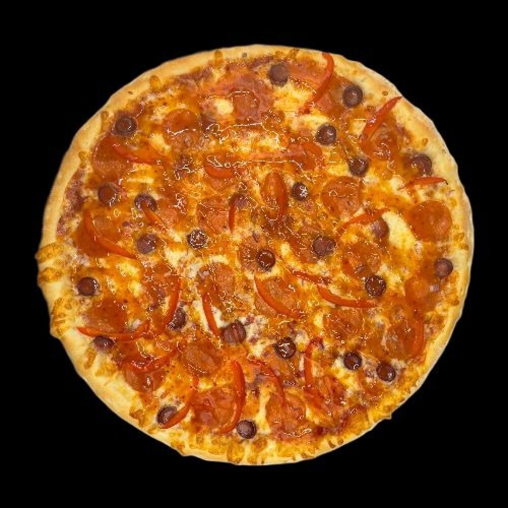 Пицца соус, моцарелла, пепперони, охотничьи колбаски, перец болгарский, лук красный, соус сладкий-чили