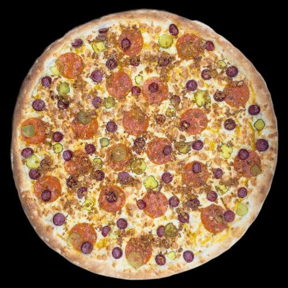 Горчичный соус, моцарелла, пепперони, охотничьи колбаски, корнишоны, лук криспи