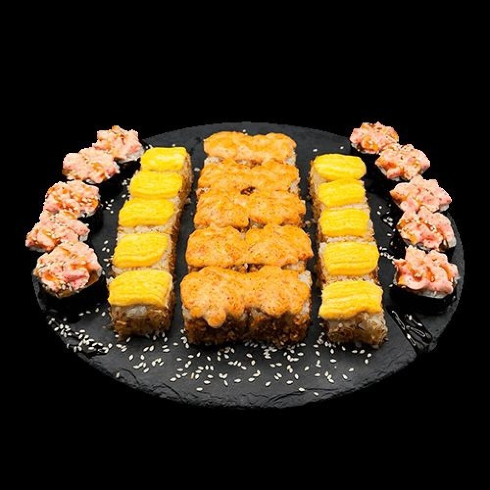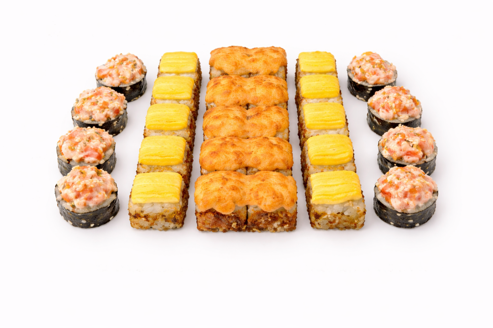 Запечённый ролл с кальмаром (Икорный соус, кальмар, соус унаги, кунжут.)