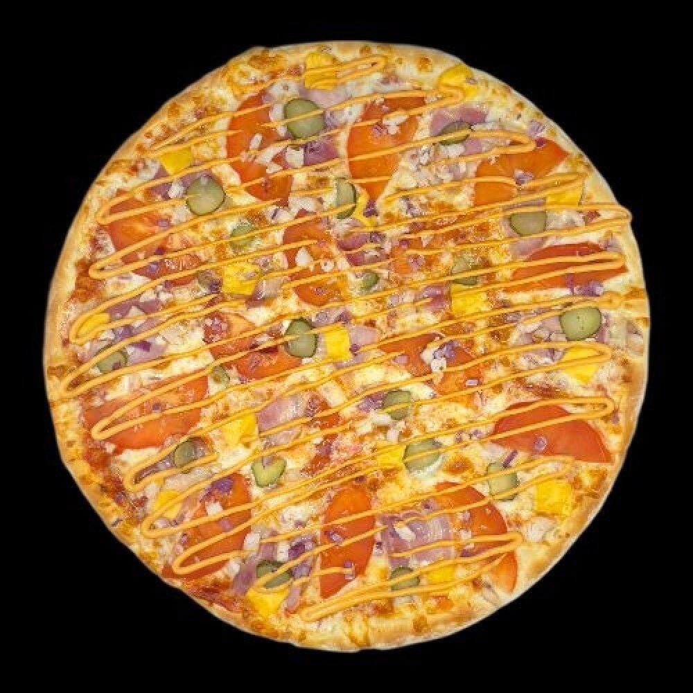 Пицца соус, моцарелла, бекон, курица, помидора, корнишоны, чеддер, лук красный, бургер соус