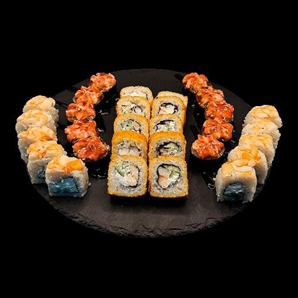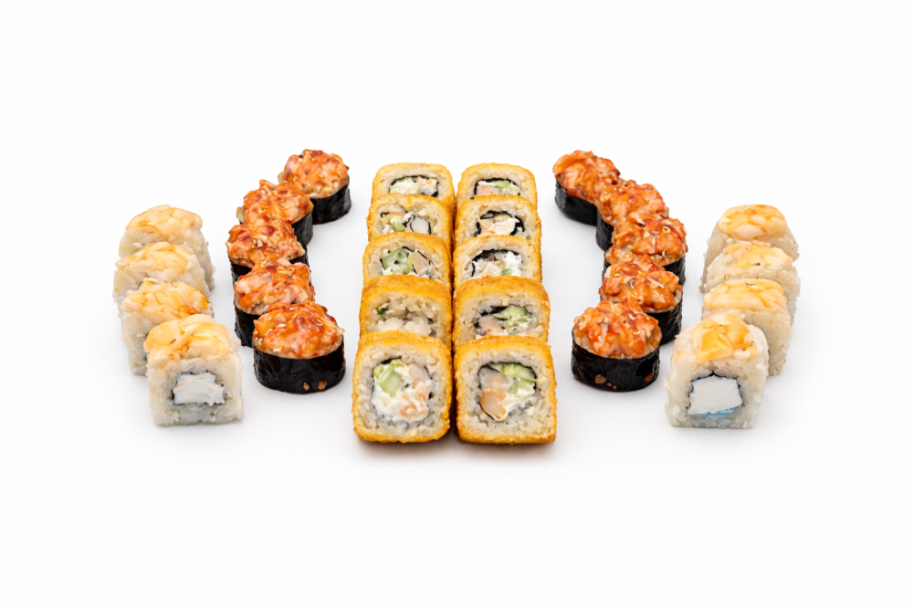 Запечённый ролл с креветкой (Икорный соус, креветка, соус унаги, кунжут)