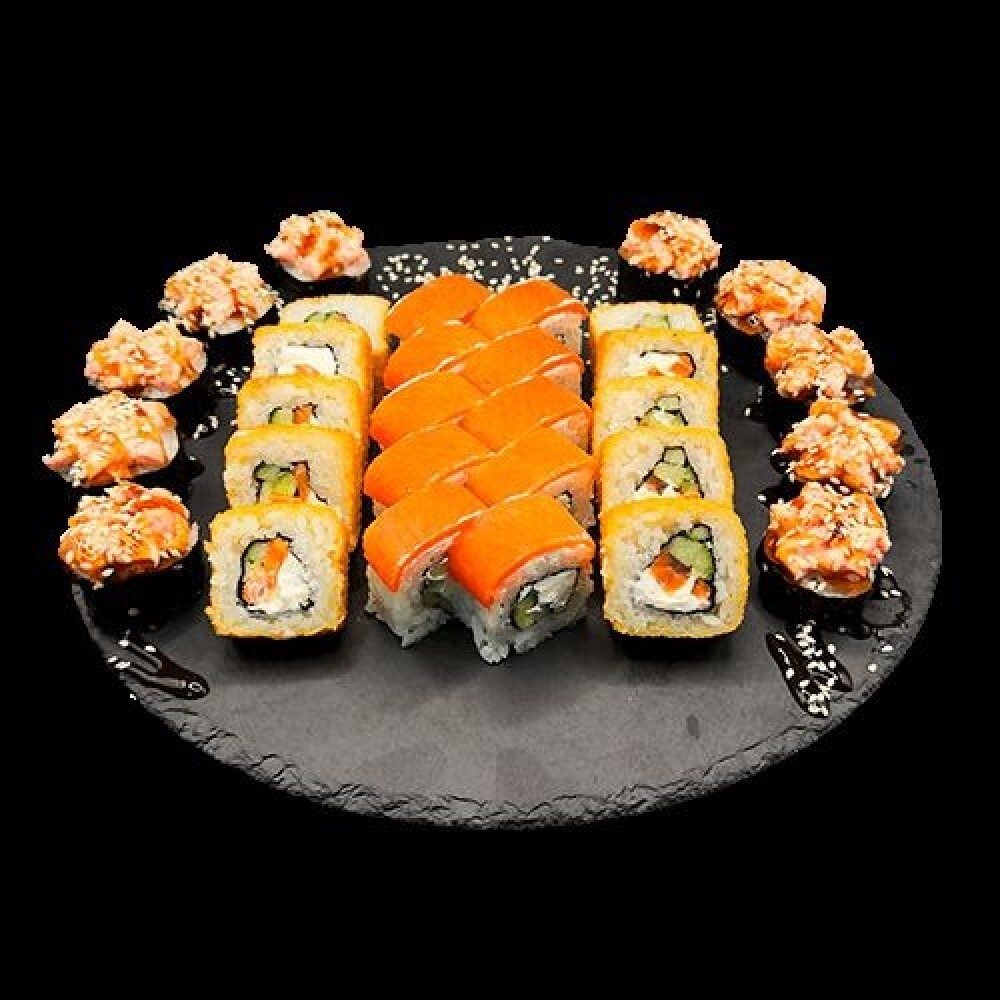 Запечённый ролл с лососем (Икорный соус, лосось, соус унаги, кунжут)