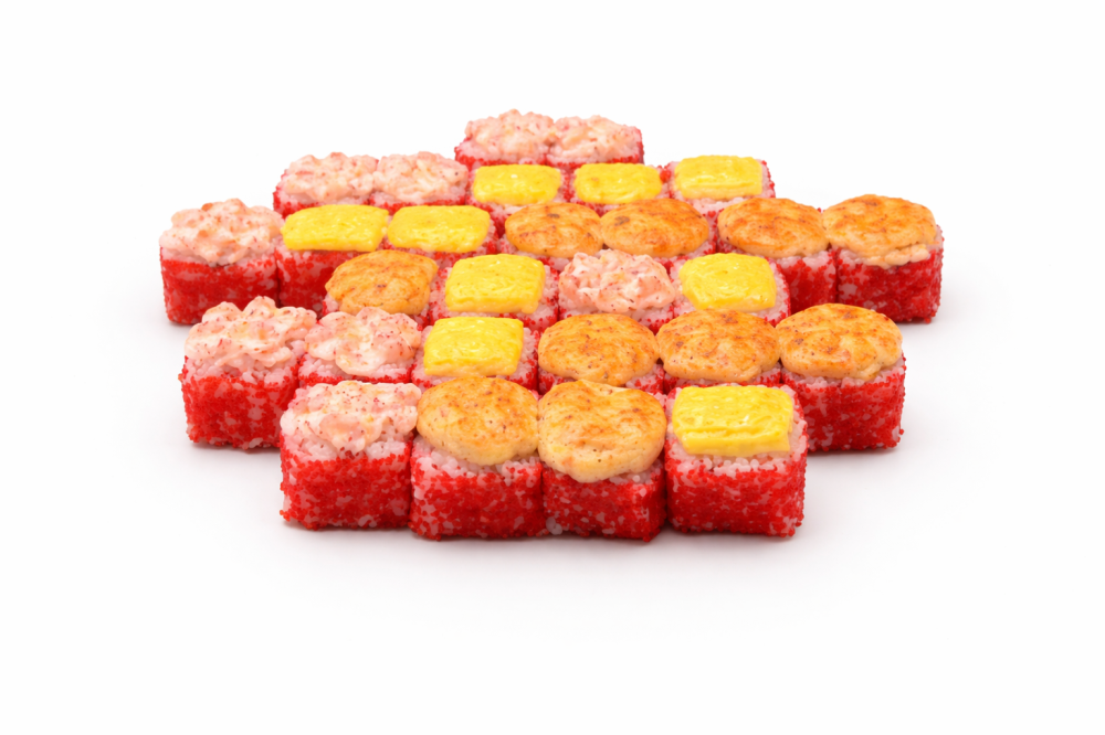 Запечённая калифорния с крабом (Майонез, огурец, краб, икра тобико, икорный соус.)