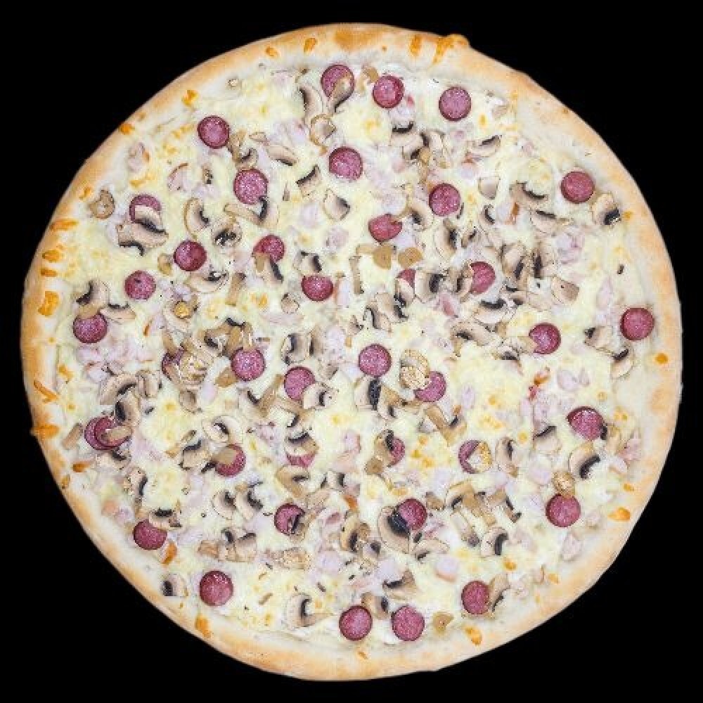 Грибной соус, моцарелла, курица, охотничьи колбаски, шампиньоны