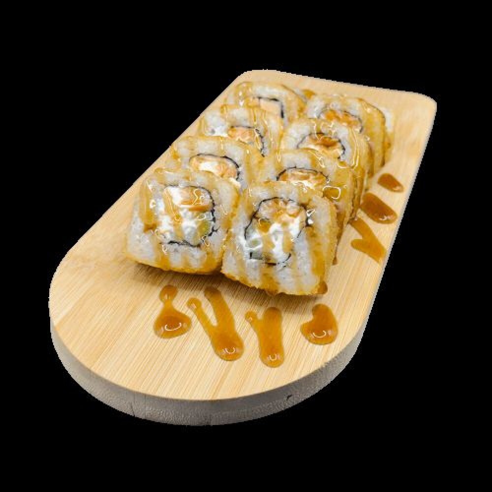 Сыр твороженный, огурец, лосось, соус унаги, панировка