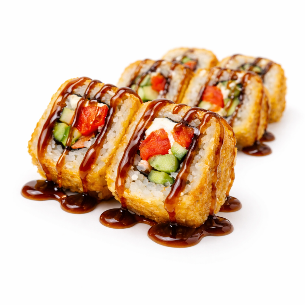 Сыр твороженный, огурец, лосось, соус унаги, панировка